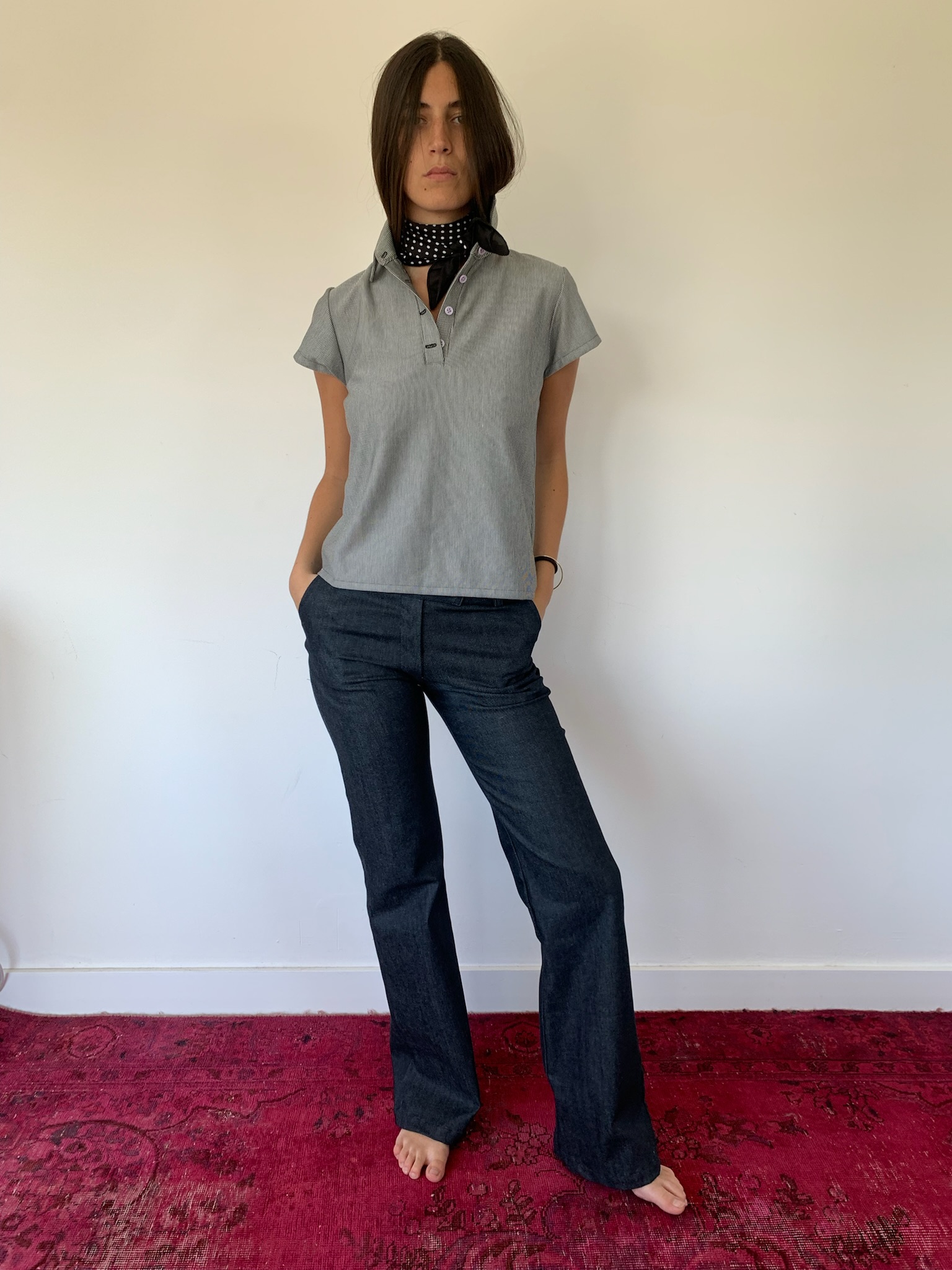 Remera polo de manga corta a rayas finas en 100% algodón, con botones frontales en color lila.