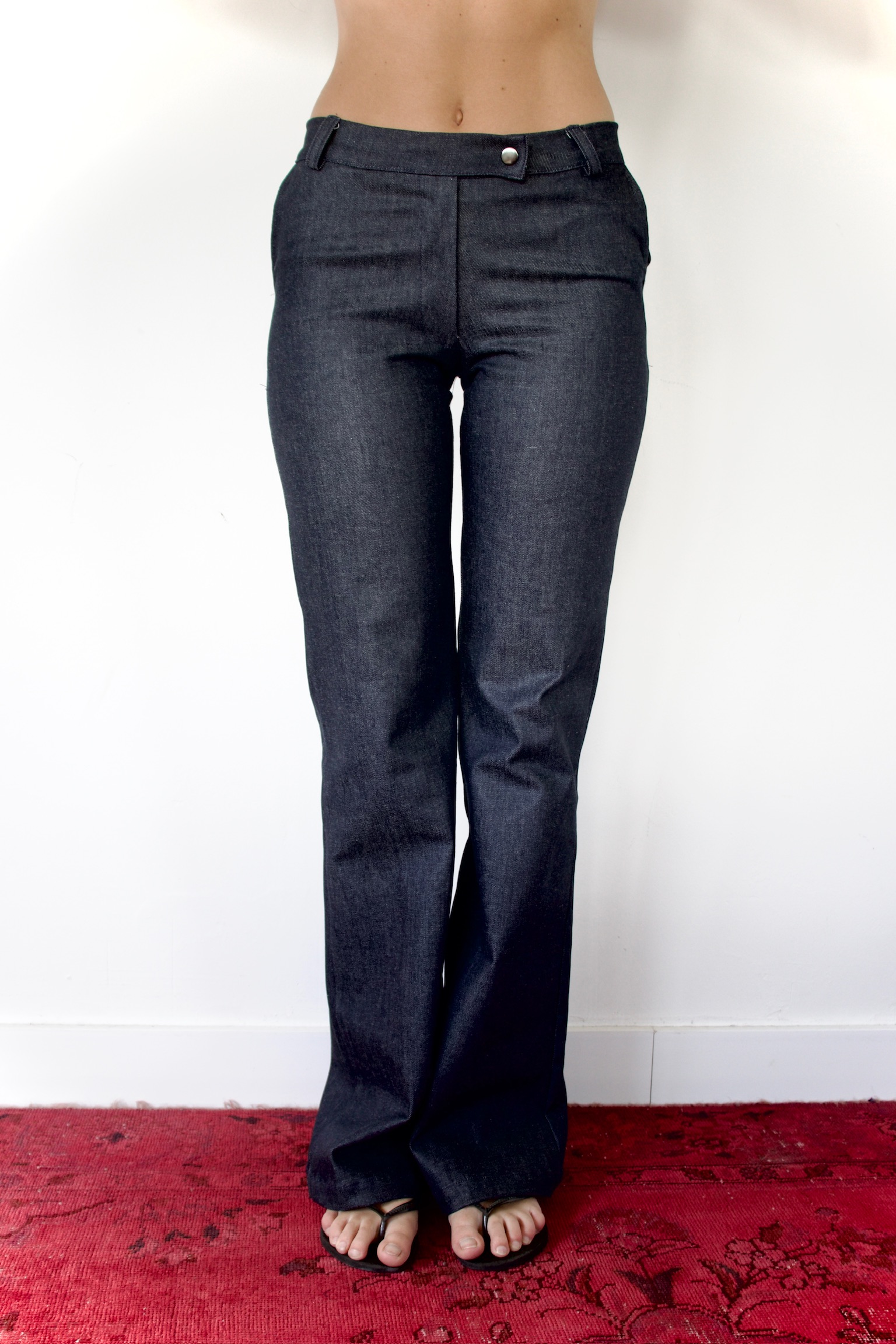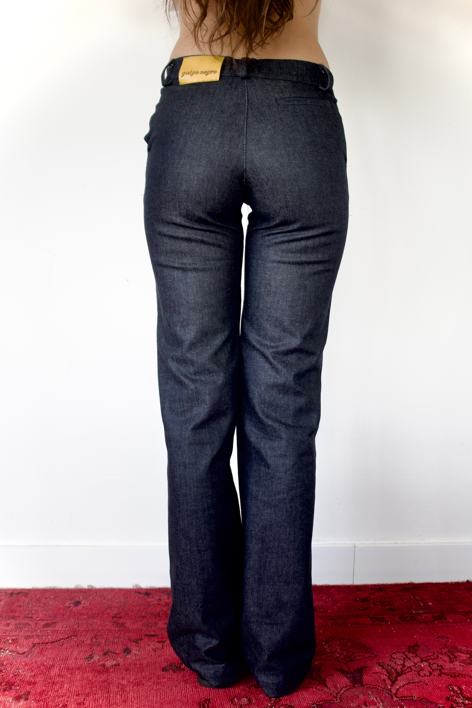 Pantalón denim azul oscuro de tiro bajo y corte recto. Etiquetas de cuero en la parte trasera de distintos colores/texturas/estampas.