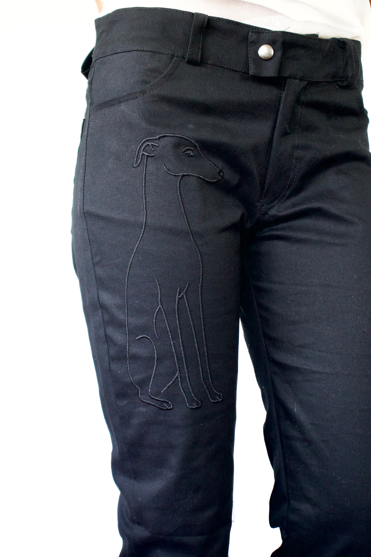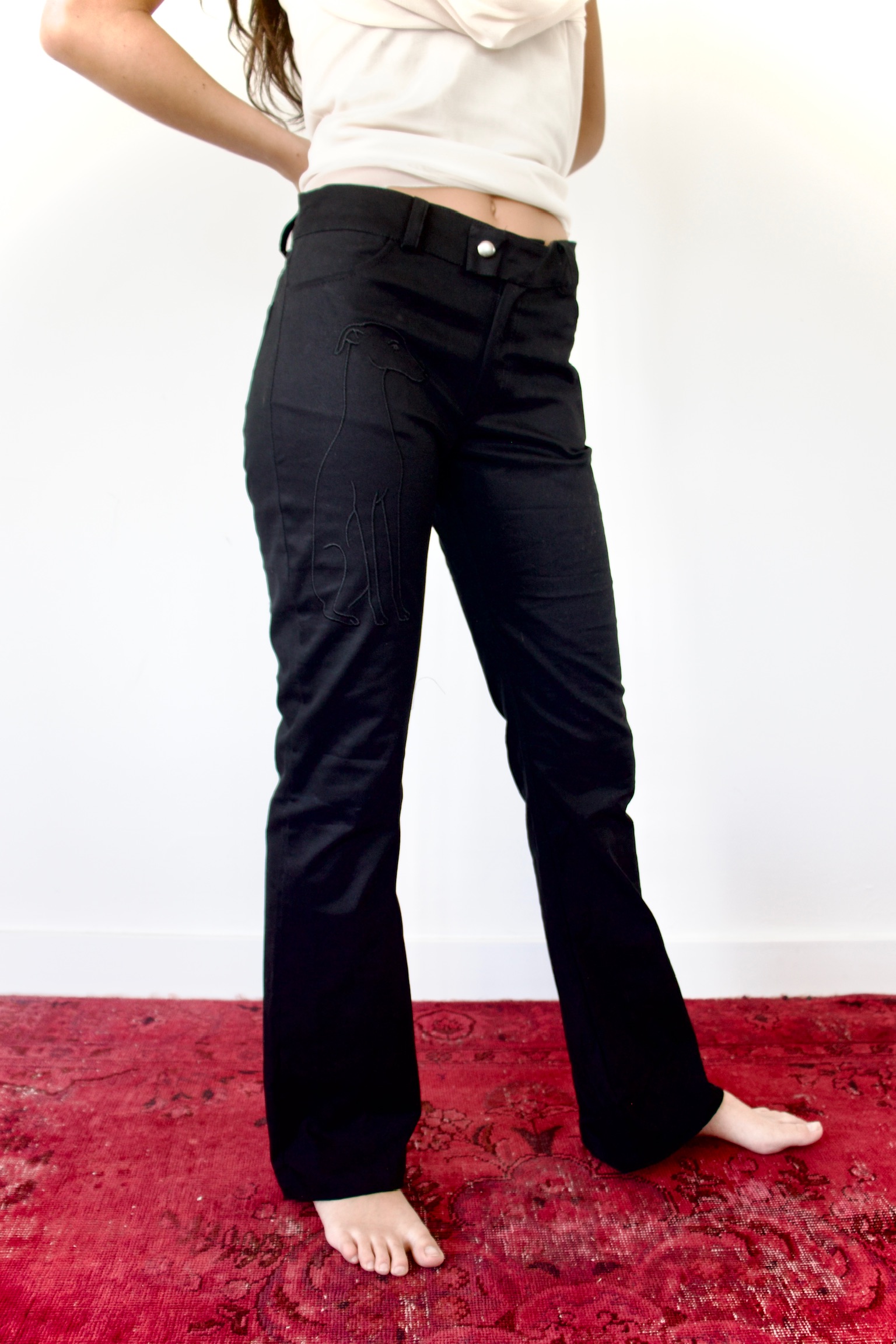 Pantalón de gabardina negra de tiro bajo, con figura de galgo bordado en la pierna.